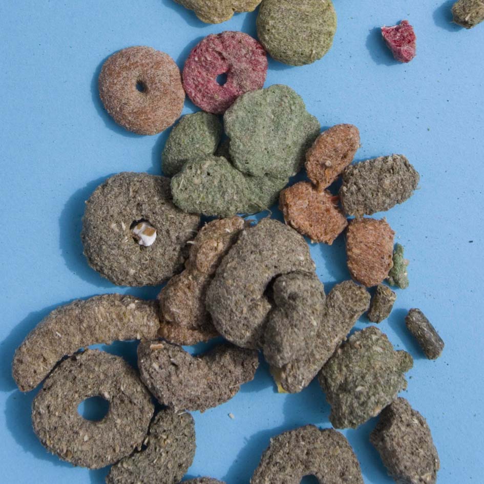 Like nuggets, 'extrusions' are a cooked mixture of ingredients. The ingredients and analysis of these vary between brands of muesli mix. The pieces can be different sizes and shapes because the mixture is squeezed through a special die. Some companies add food colourings, so the pieces are brightly coloured, which may increase the visual appeal of the mix to owners but will make little difference to the rabbit.