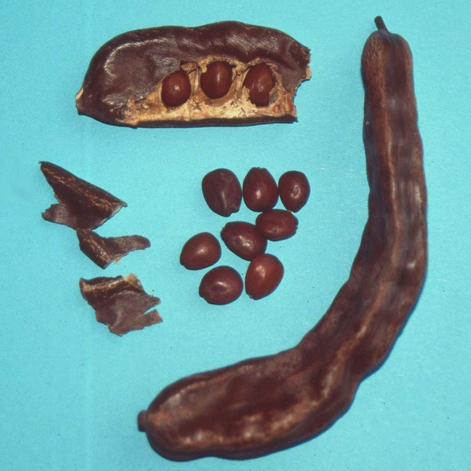 Locust beans are the pods of the Mediterranean carob tree (Ceratonia siliqua). The pod is several inches long, hard, and dry and contains several seeds that are used in the food industry. Crushed pieces of the pod used to be a common component of muesli mixes, but the seeds sometimes made their way into the mixture as well. The leading manufacturers of muesli mixes withdrew locust beans from their mixtures as the result of several fatalities in rabbits that swallowed the seeds and died from intestinal obstruction. Ground pods are included in some pellets and nuggets.